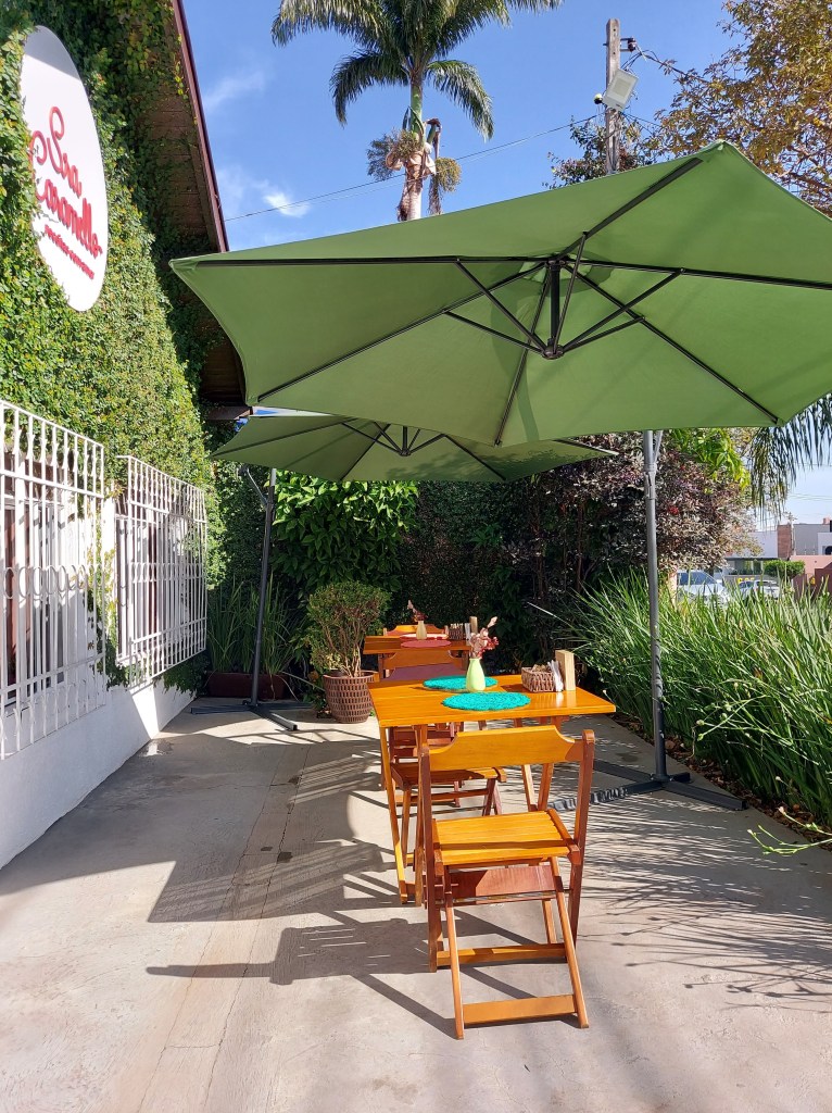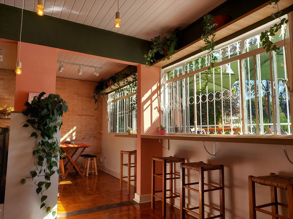 Ficamos na área interna, onde tinha um sofá bem gostoso para Naoki poder sentar todo esparramado, como ele gosta, mas há mais mesas fora também, algumas delas com guarda-sóis e um jardim (sim, mais plantinhas) ao lado.