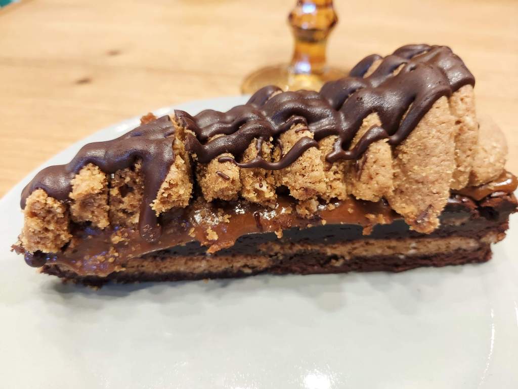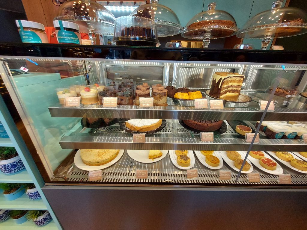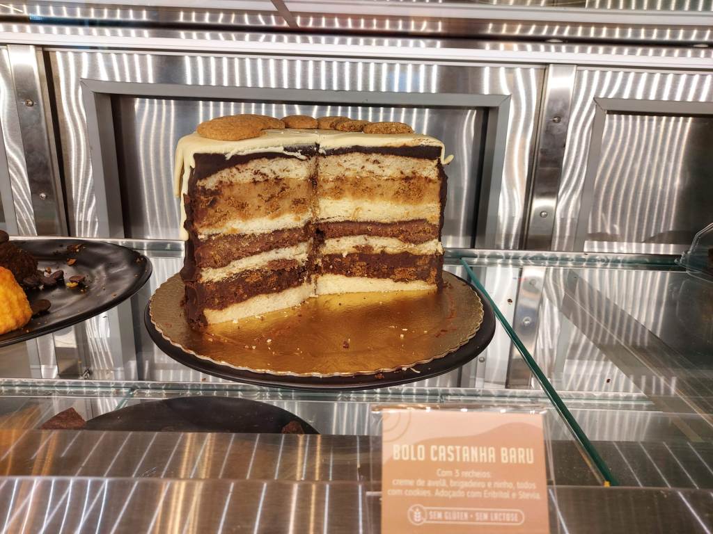 A vitrine com as comidas são muito bem servidas. Fica até difícil escolher o que pedir (motivo pelo qual eu terei de voltar em breve, rs), mas acabei optando por uma torta de cookies deles, que achei bem gostosa, embora o bolo que leva o nome da padaria parecesse muito apetitoso também! É de se comer com os olhos mesmo. E o interessante também é que não leva na receita açúcar refinado, embora seja sim adoçado. Há no cardápio, ainda, opções sem lactose, o que amplia o público da padaria. Mas mesmo quem não têm restrição alguma, eu diria que vale muito a pena conhecer.