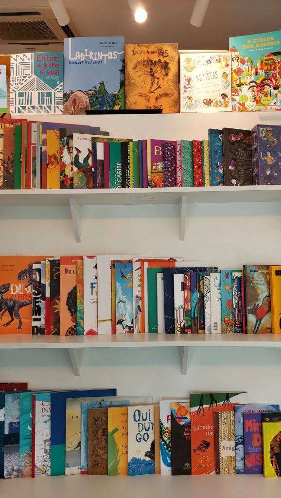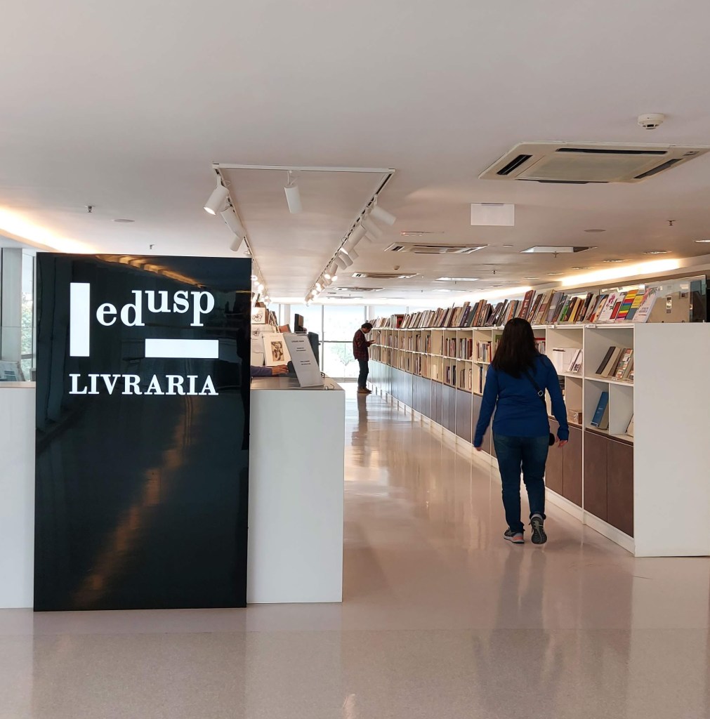 Paramos na Livraria Edusp que há no prédio, que, embora de dimensões enxuta, contém edições bem interessantes, que vão desde Artes Visuais até Literatura infantil.