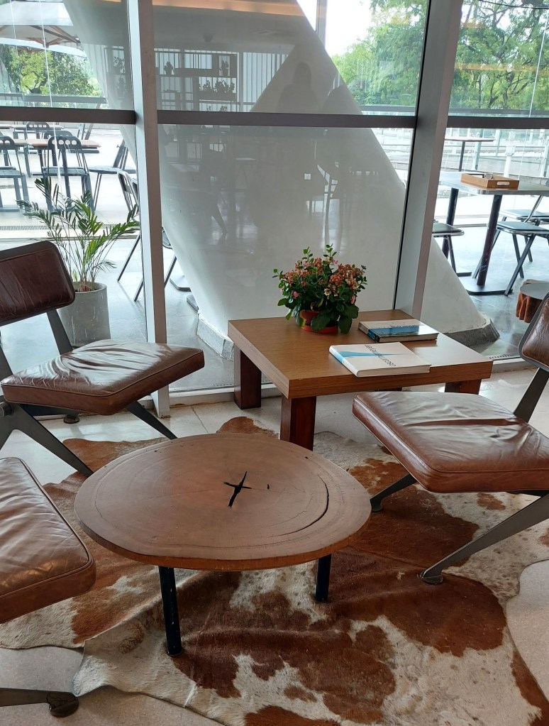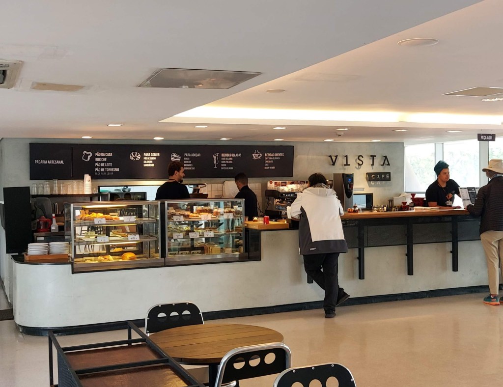 Ainda no andar da livraria (mezanino), há um café, o Vista Café. O aroma de comida dele se espalha por todo o piso, e já te recepciona logo que se sai do elevador. Guerreiros fomos nós, de mesmo assim termos resistido e ido primeiro à livraria. Mas essa bravura toda não durou muito tempo, porque, se a ideia era almoçar no Vista Restaurante, nossos estômagos preferiram já comer algo no Café mesmo.