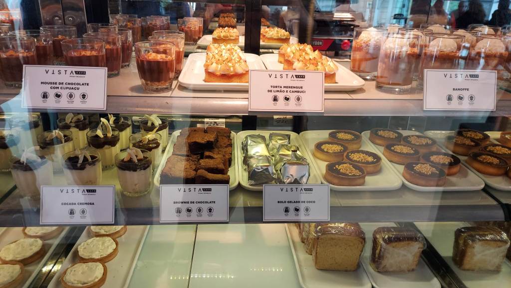 No Café, as comidas da vitrine estão com algumas indicações de restrições alimentares, tais como “glúten, lactose, vegano”. Sempre acho extremamente útil quando há essas indicações, pois não preciso ficar perguntando e fica mais fácil de me decidir pelo quê comer.