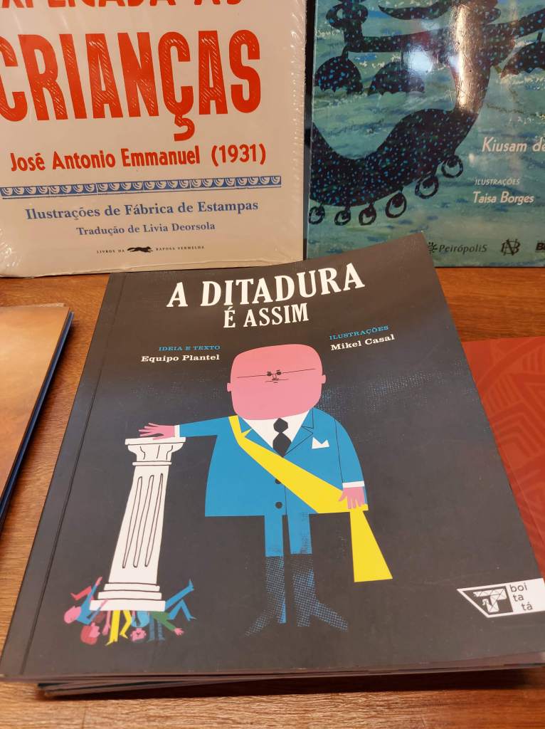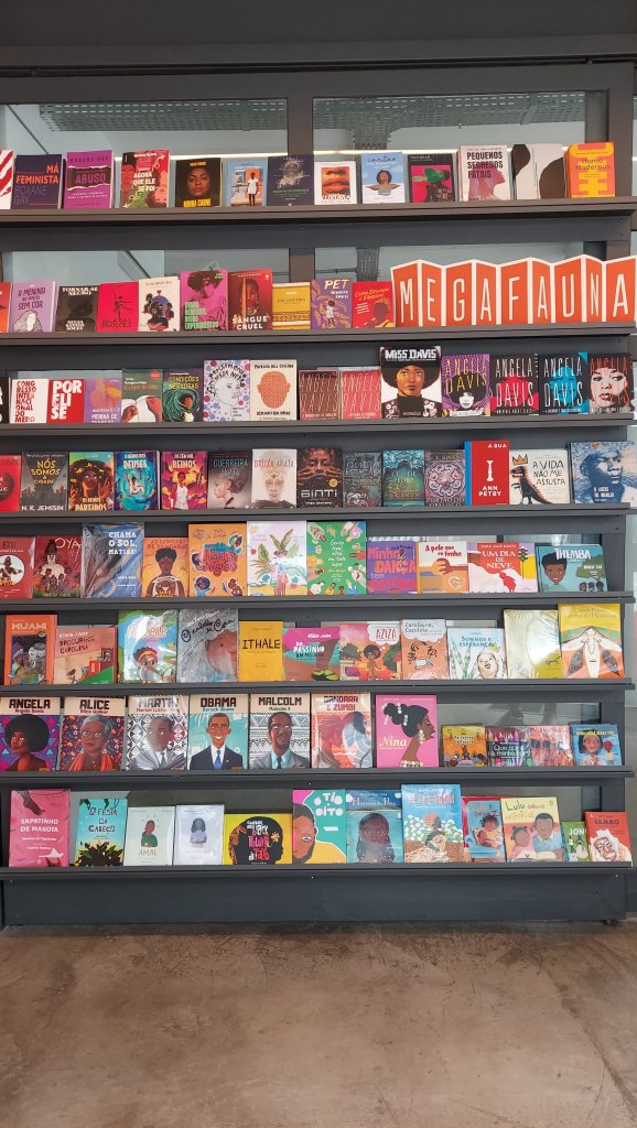 A livraria tem a proposta de diversidade e acolhimento para toda a sua cadeia, dos livros, aos leitores, passando, claro, pelos livreiros. E, esse acolhimento é real, porque, até como mãe-leitora, me senti muito bem-vinda lá. Naoki ficou tão à vontade que além de pedir para ler (adivinhem?) “Nada na vida me assusta”, ainda quis mamar por lá. Se quiser saber mais sobre a livraria, confira no site deles, está imperdível.