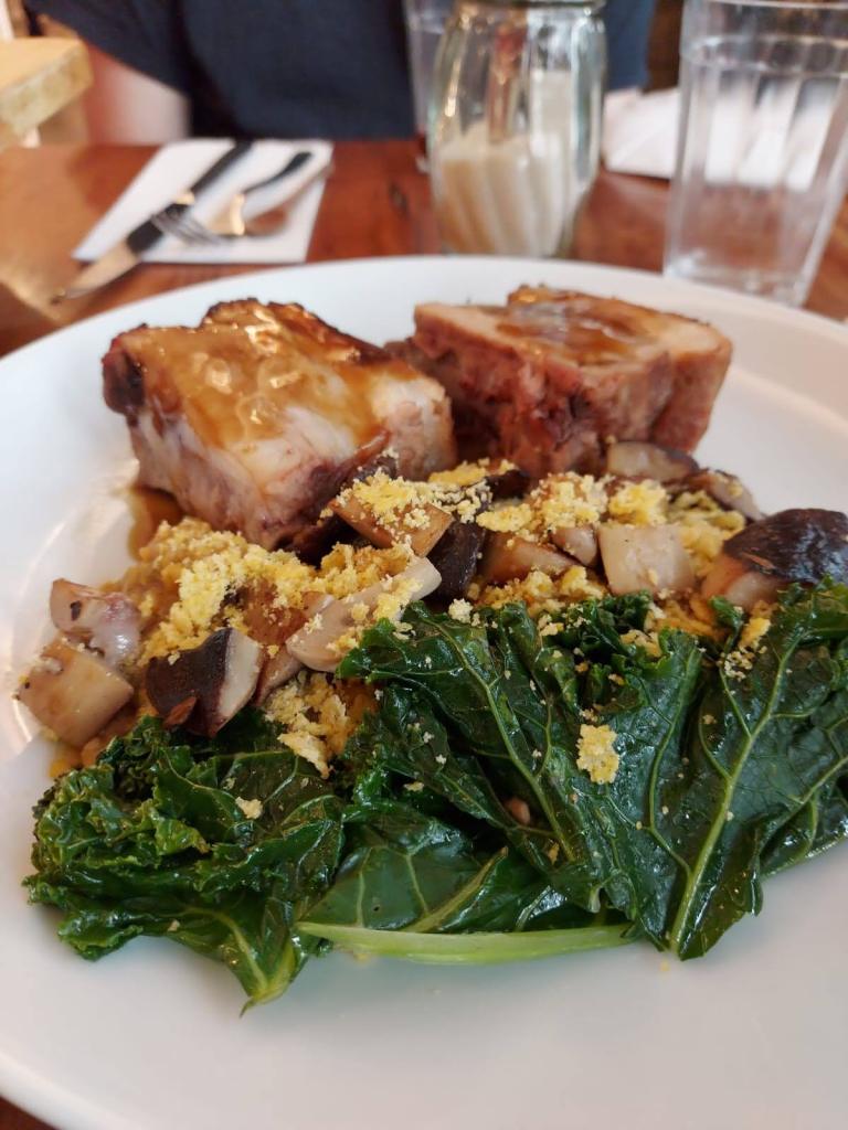 - Eu e minha cunhada pedimos: costelinha de porco ao molho de melaço de cana com canjiquinha, cogumelos e couve kale;