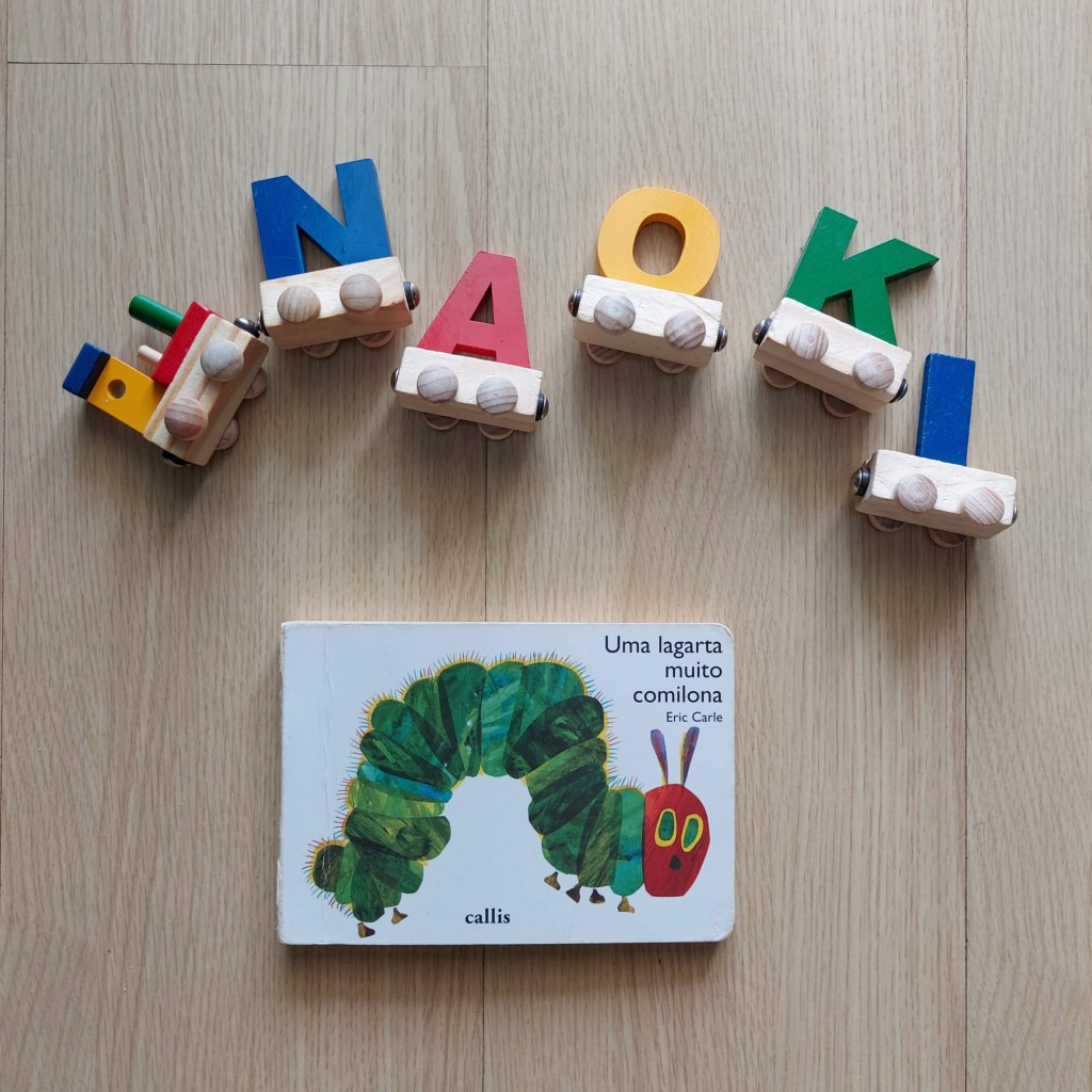 Uma lagarta muito comilona, de Eric Carle, é um clássico infantil que conheci graças a uma amiga minha, também mãe, a Day. Foi o primeiro livro que de fato comprei pro Naoki, já que os primeiros livros dele mesmo foram recebidos. Eu queria muito saber porque este livro era tão querido pelas crianças, então comprei. Ele foi lido pro Naoki ao longo de todo o tempo desde que chegou em mãos aqui em casa (estou falando do livro, ok? Hahaha). Na fase de introdução alimentar, foi um grande alidado, para começar a explicar para ele da importância de comer, sobretudo alimentos saudáveis. Hoje em dia, Naoki se interessa pelo livro mas por outros motivos, pela previsibilidade da história (que ele já conhece há tanto tempo), e de, portanto, poder contribuir para a narrativa dela, à sua maneira (ele antecipa o que vem a seguir na história). Também adora ver a transformação da lagarta em borboleta. Sim, essa é uma história sobre alimentação, mas também sobre metamorfose, sobre mudanças. É um clássico porque ele conta com imagens muito coloridas e cativantes, permite que a criança viva a experiência a leitura através do tato também, e porque é realmente divertido ver todas as comidas que a lagarta come.