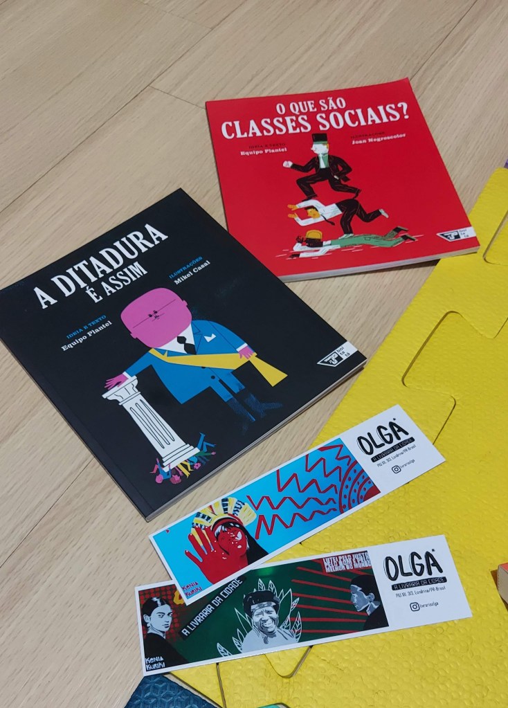 Quem se lembra do “A ditadura é assim”, que eu já havia namorado muito na livraria Megafauna? Pois gostei tanto da coleção que comprei também “O que são classes sociais?”. Sei que vai levar um tempo ainda para ler este livro com ele ou ele os ler sozinho, mas mesmo assim já demos uma folheada por aqui, e, para meu espanto, ele disse que “o homem [do livro] tá bravo” (sobre o livro da ditadura).