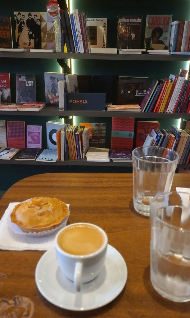 O café (ou chopp) pode ser servido tanto nas mesas externas quanto nas internas, o que é bem legal para quem gosta de apreciar um cafezinho rodeado de livros (eu adoro) e também nos dias ou muito quentes ou muito frios ou muito molhados.