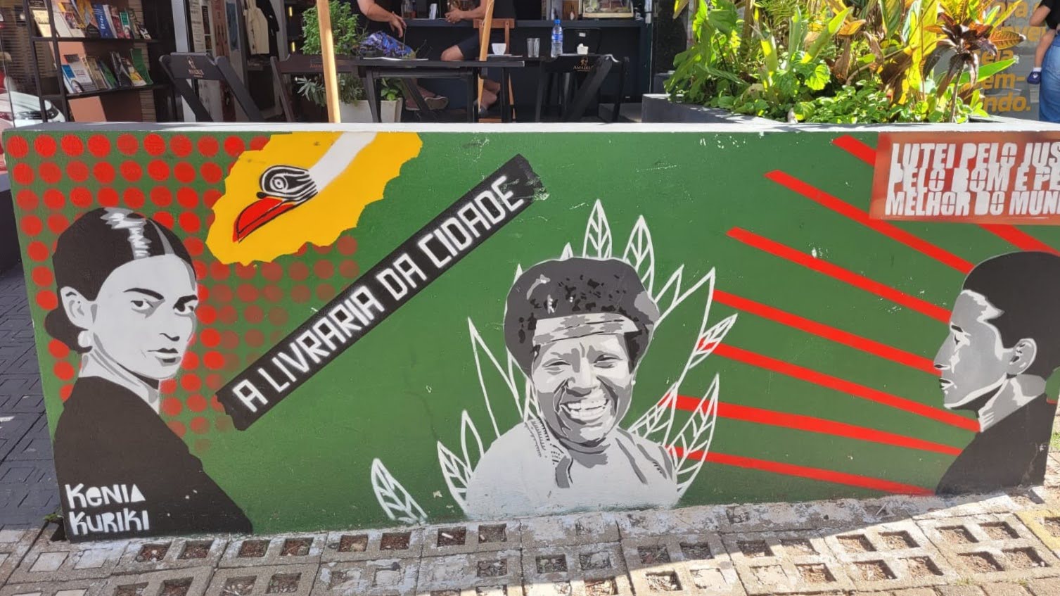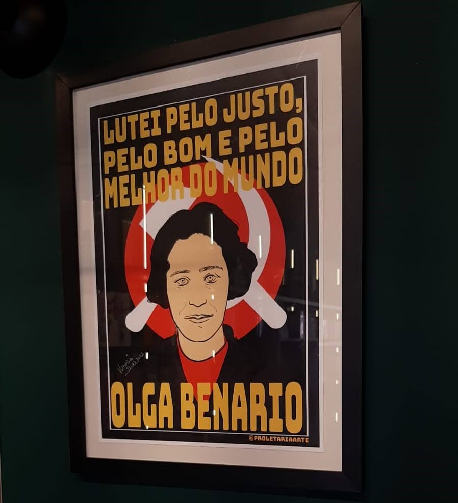 Na fachada da livraria, vê-se a imagem de três grandes mulheres: Frida Kahlo, Lélia Gonzalez e, claro, levando o espaço seu nome, Olga Benario. As imagens são arte em grafite, e foram feitas pelas mãos da artista Kenia Kuriki (@keniakurikiart).
