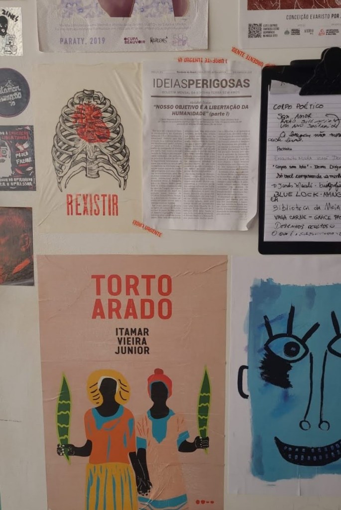 Se por acaso, você for à livraria e não encontrar o livro que queria, na parede esquerda (para quem entra na loja), existe uma prancheta com papel almaço, onde você pode escrever o nome do livro que gostaria que eles providenciassem. É difícil não notar a parede em questão, porque ela está cheia de colagens, com cartazes, pôsteres, recortes e adesivos.