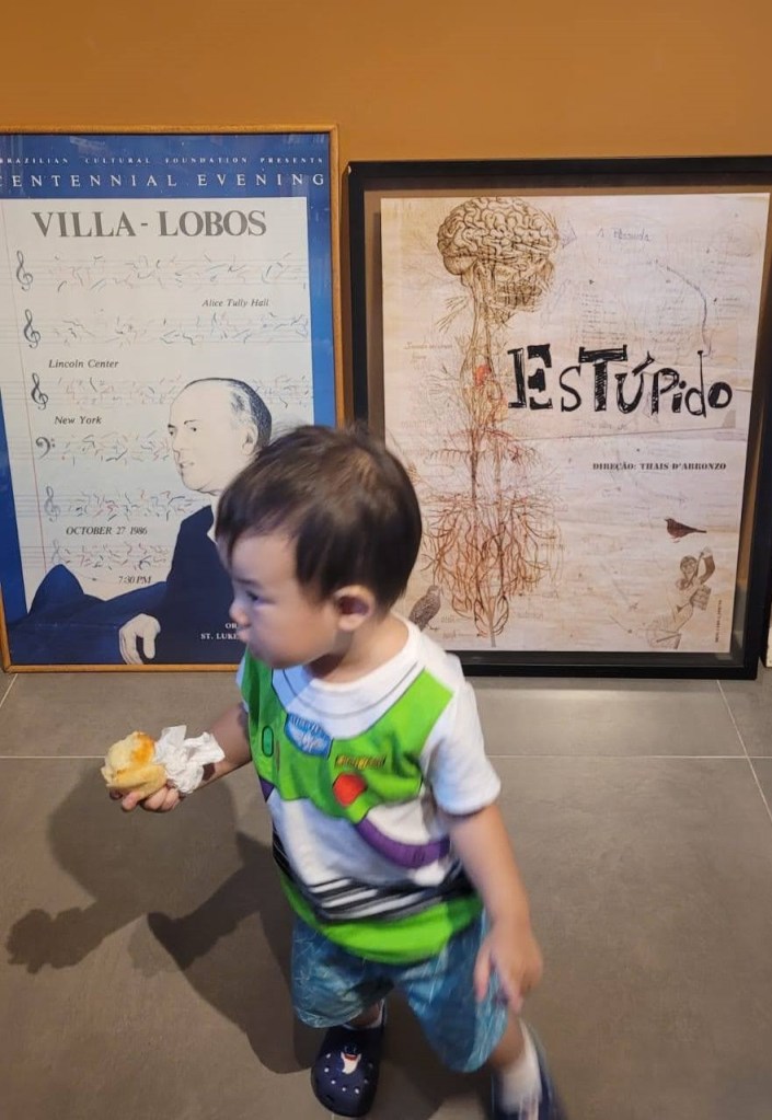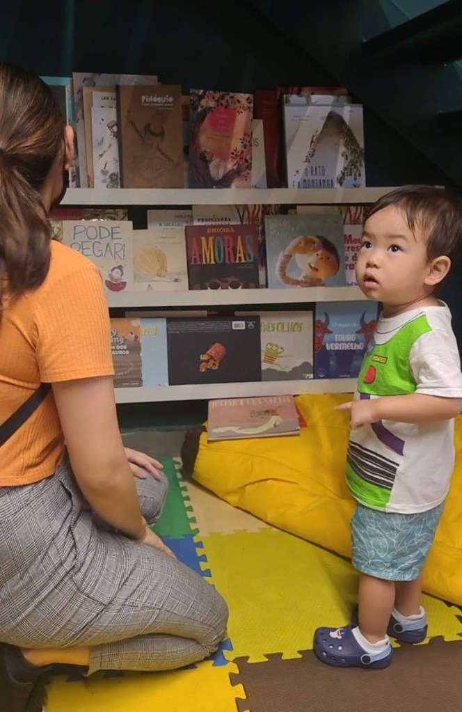 Voltando ao passeio… abaixo da escada que leva ao mezanino que mencionei antes, há um cantinho muito aconchegante de leitura para crianças, onde também ficam os livros infantis. Naoki, claro, deu uma explorada por lá, mas, aproveitando o movimento típico de um centro urbano, quis sentar-se à frente, no café, para deixar-se curtir vendo a pressa alheia enquanto apreciava seu pão de queijo.