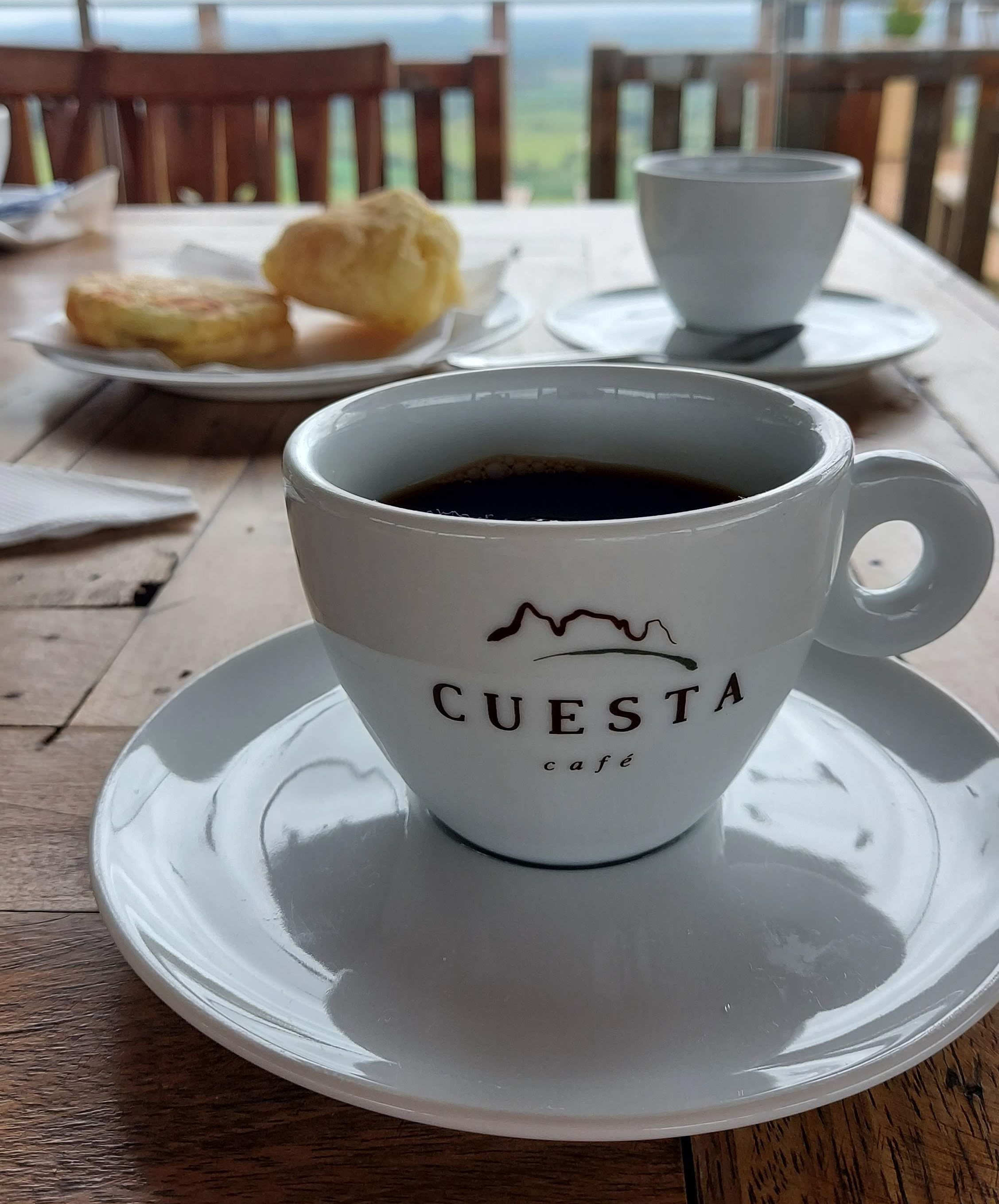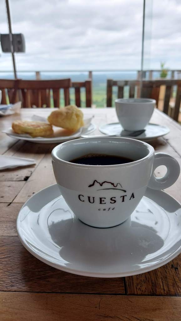 Cuesta é uma forma de relevo que mostra o resultado do trabalho de uma erosão diferencial, tendo um lado com escarpa abrupta e outro com declive suave. Sem querer se prender a conceitos de geologia, qualquer pessoa que for ao café irá se deslumbrar com a vista.