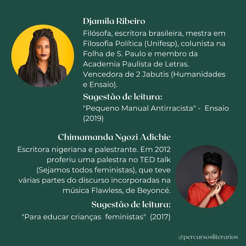 Você pode encontrar aqui no blog as resenhas de Pequeno Manual Antirracista, de Djamila Ribeiro, e Para Educar crianças feministas, Americanah, No seu pescoço e Sejamos todas feministas, da Chimamanda.