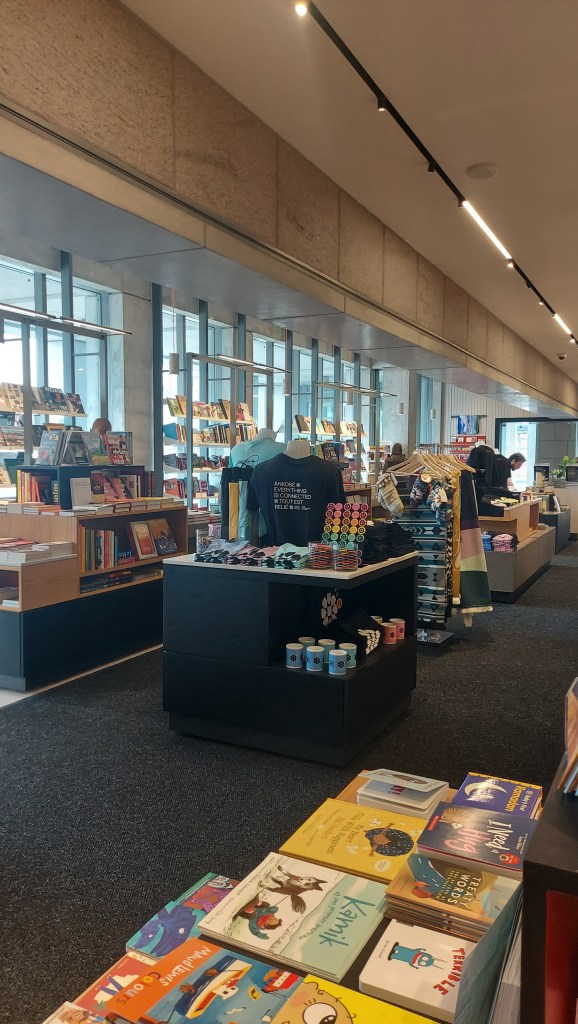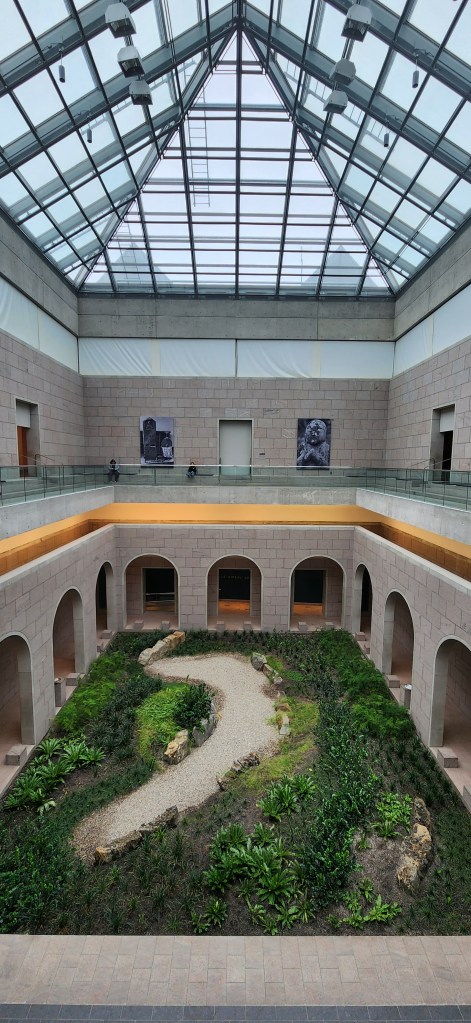 Passando por esse hall com teto de vidro, há os sanitários, a chapelaria, e a vitrine da boutique, a loja do museu. E passando a loja, temos uma cafeteria, cujo acesso se dá também pela boutique, e próximo à entrada principal do museu (que dá acesso também ao Maman), fica a bilheteria.