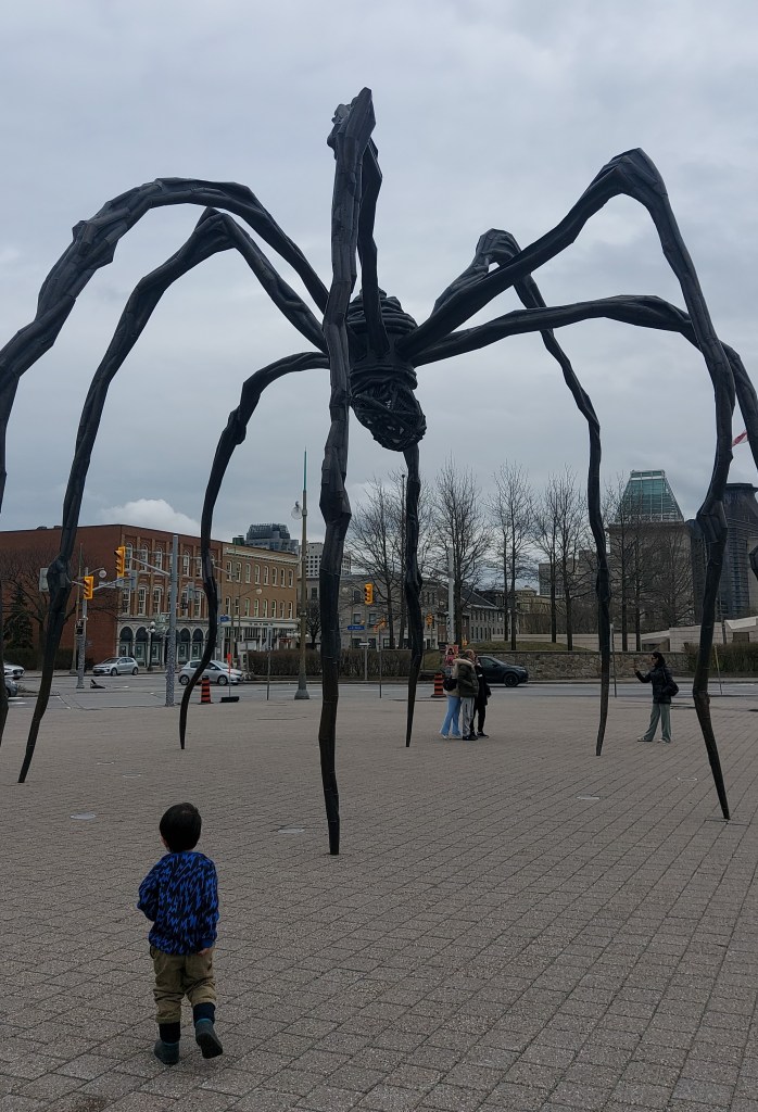 Eu li “Em família” para o Naoki, e no livro, uma família vai ao museu, e então algumas obras são referenciadas, visualmente. Fui atrás das referências, e acabou que uma delas me levou à obra “Maman”, a aranha gigantesca de Louise Bourgeois. Não demorou muito e descobri que uma das Maman (são 7, uma de aço inoxidável e mármore e outras 6, que são uma série, de bronze e mármore) estava em Ottawa, a capital do Canadá, bem próximo de onde viríamos a passar 6 meses, em Kingston, Ontário.