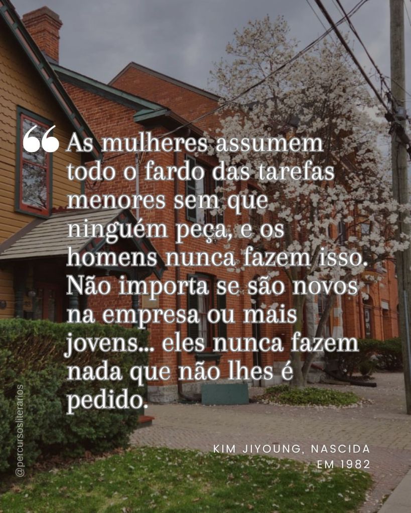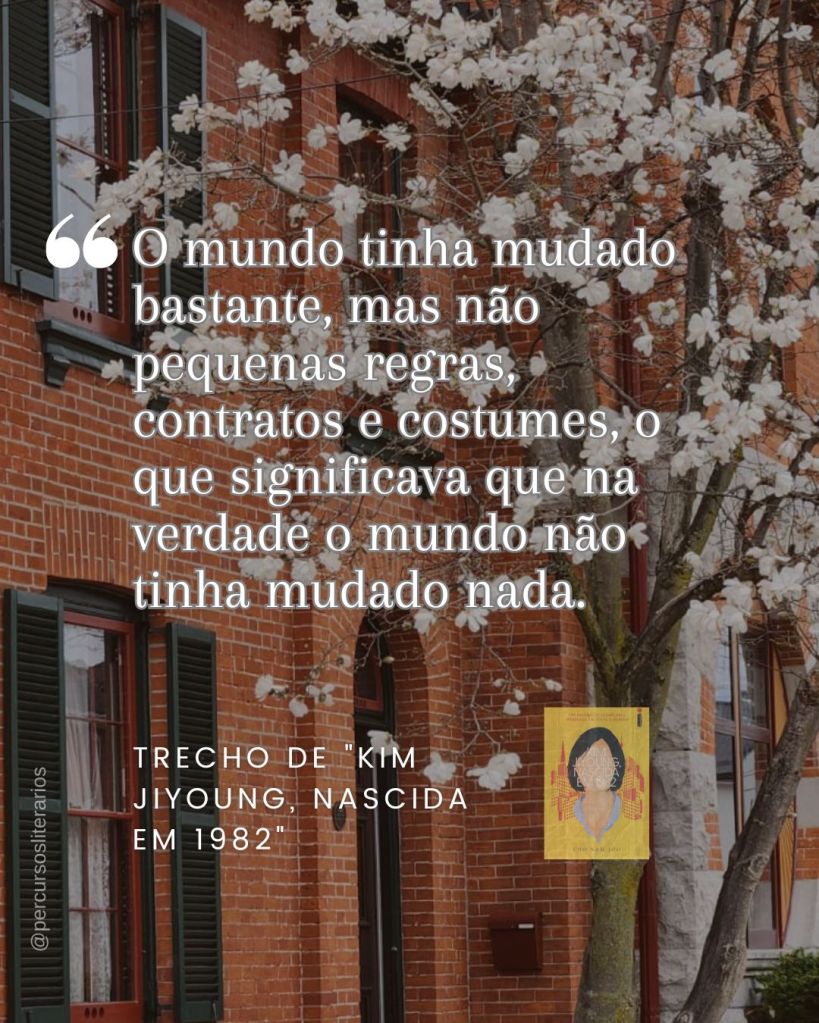 O título talvez soe como o de uma biografia, se é proposital ou não, não sei, mas o livro tem esse efeito sobre as mulheres que o leem: a sensação de já ter passado por muitas das situações nele descritas, mesmo que a história se passe num país e numa cultura bem diferente, na Coreia do Sul, onde, pelo livro, a cultura é bem machista e misógina.