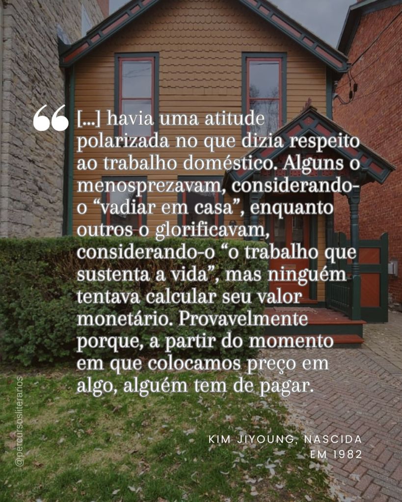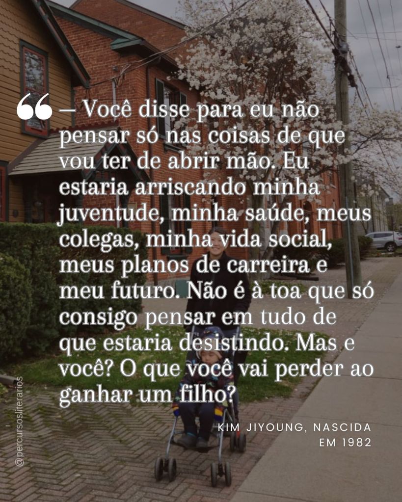 Sua narrativa que me lembrou um pouco “Queria morrer, mas no céu não tem tteokbokki”, embora em “Kim Jiyoung” a escrita seja bem mais desenvolvida e envolvente. Mas a comparação é porque ambos deixam no ar muita coisa, como se o leitor tivesse de pegar as informações nas entrelinhas. Leituras assim podem ser muito boas, quando as entrelinhas podem ser preenchidas por experiências pessoais similares do/a próprio/a leitor/a.