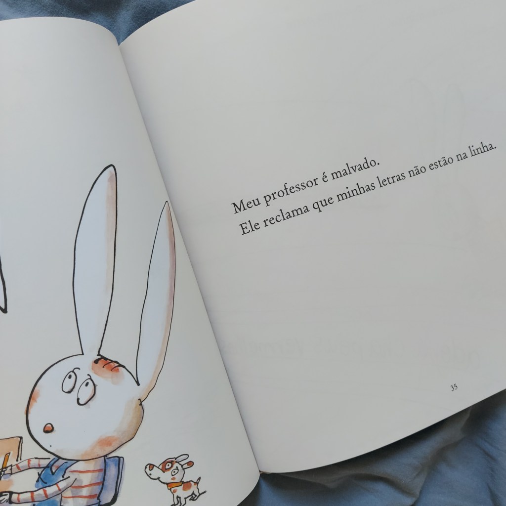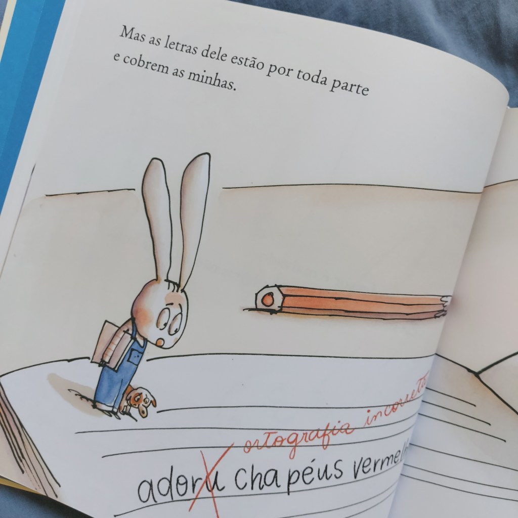 Sobre esta cena, meu filho me perguntou por que o caderno do coelho é tão pequeno, e expliquei para ele que algumas vezes as pessoas falam de um jeito que faz a gente se sentir muito pequeno, ou com vontade de encolher e sumir, e então, quem desenhou fez assim pra gente entender que naquela hora o coelho se sentiu muito pequeno. Acho que ele, infelizmente, entendeu, porque depois disso, não perguntou mais.