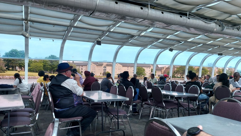 Eu e João tínhamos receio do passeio a barco, porque nós dois somos do tipo que tem mal-estar fácil (é, a idade bateu pra gente, pessoal). Acontece que Naoki, nosso filho, queria muito conhecer um barco, então decidimos arriscar. O dia, porém, estava perfeito, sem vento, e não estava quente e nem frio. Acabamos fazendo o passeio em outro barco (Island Star), que não o que costumeiramente realiza o Discovery Cruise (feito pelo Island Belle 1). O Island Star é uma embarcação que na verdade opera com o serviço de restaurante, e, talvez por isso, balance menos. No dia, porém, ele não estava disponível como restaurante, e portanto o preço foi o mesmo do Discovery Cruise. Naoki gostou muito de poder subir no deck e sentir o vento bagunçando seu cabelo e fazendo muito ruído em seu ouvido, além de poder ver as ondas que a própria embarcação produzia no belíssimo Lago Ontário.
