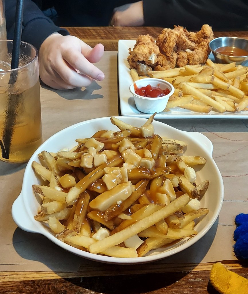Pode não ser o melhor prato do mundo, mas se você já vier ao Canadá, acho que é uma experiência válida. Na verdade, minha opinião, não muito gentil, é que estragaram a batata frita, porque batata frita gostosa é aquela crocante, não é mesmo? Mas então, o poutine é nada mais que uma porção de batatas fritas, mas com um molho de carne (saboroso, ok?) e pedaços de queijo (também gostoso) por cima. Isso tira toda a crocância da batata.