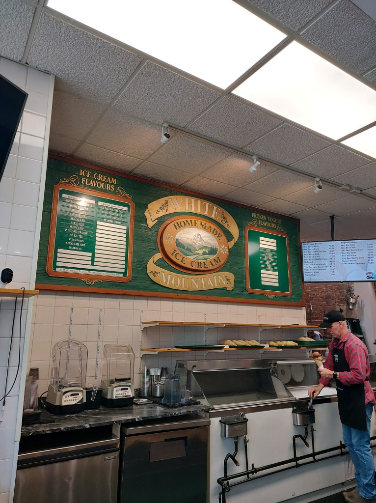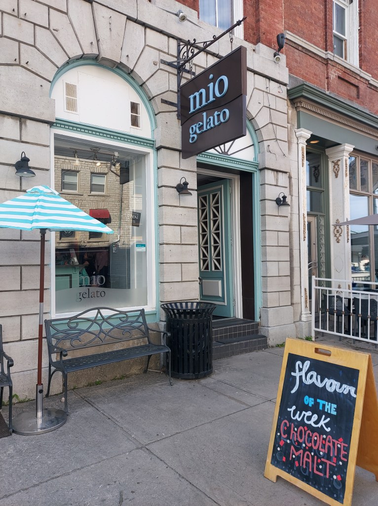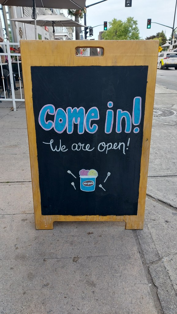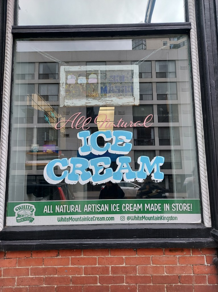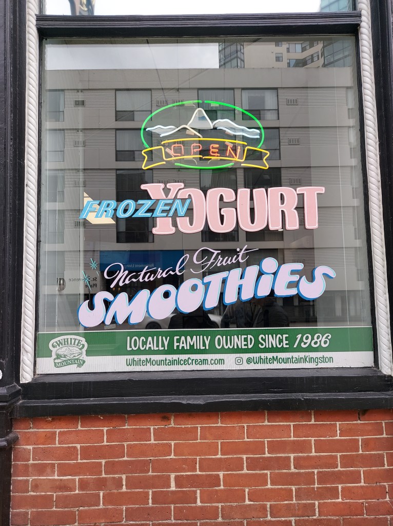 A sorveteria tem essa plaquinha muito charmosa, que foi o motivo de eu tê-la escolhido no dia. O homem que nos atendeu, provavelmente o dono do estabelecimento, também foi muito simpático. Depois vim a tomar da sorveteria quase ao lado, onde vim a apreciar mais o sabor e textura, mas o que me ganhou demais na White Mountain foi a acessibilidade. Eu saí muitas vezes empurrando o carrinho com Naoki, mesmo ele já tendo seus 3 anos e tanto, porque não era raro que uma saída se estendesse por quilômetros andando. É fácil se empolgar batendo perna quando a cidade é muito plana e bem planejada para pedestres como no caso de Kingston. Mas crianças pequenas assim não aguentam andar tanto. Então acontecia de algumas vezes eu estar sozinha. As portas por lá são pesadas, para barrar o vento gelado no inverno, mas isso cria uma certa dificuldade quando se tem carrinhos de bebê envolvidos e nenhum botão de abertura automática. Se na equação tiver escadarias, bem, daí complica um pouco. Numa das idas à sorveteria em que estavam apenas eu e meu filho, bem, não foi difícil escolher qual sorveteria ir.