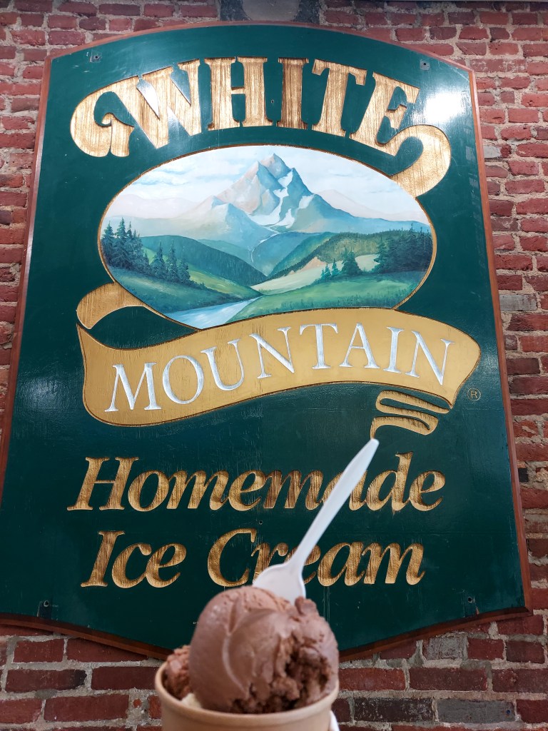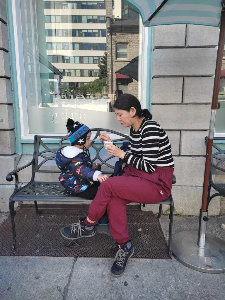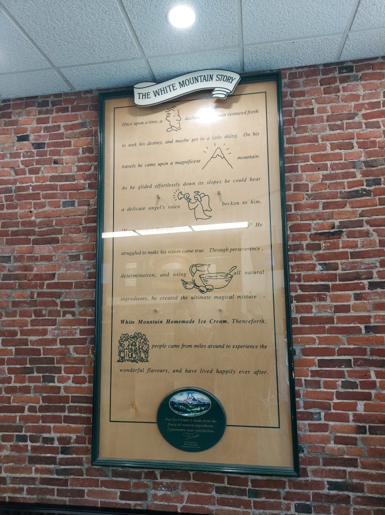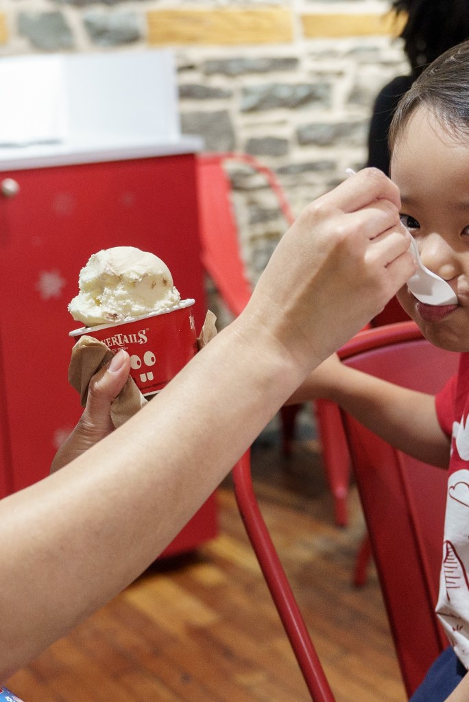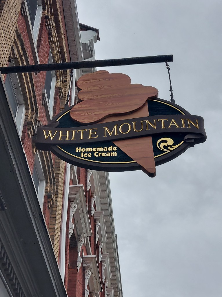 A sorveteria tem essa plaquinha muito charmosa, que foi o motivo de eu tê-la escolhido no dia. O homem que nos atendeu, provavelmente o dono do estabelecimento, também foi muito simpático. Depois vim a tomar da sorveteria quase ao lado, onde vim a apreciar mais o sabor e textura, mas o que me ganhou demais na White Mountain foi a acessibilidade. Eu saí muitas vezes empurrando o carrinho com Naoki, mesmo ele já tendo seus 3 anos e tanto, porque não era raro que uma saída se estendesse por quilômetros andando. É fácil se empolgar batendo perna quando a cidade é muito plana e bem planejada para pedestres como no caso de Kingston. Mas crianças pequenas assim não aguentam andar tanto. Então acontecia de algumas vezes eu estar sozinha. As portas por lá são pesadas, para barrar o vento gelado no inverno, mas isso cria uma certa dificuldade quando se tem carrinhos de bebê envolvidos e nenhum botão de abertura automática. Se na equação tiver escadarias, bem, daí complica um pouco. Numa das idas à sorveteria em que estavam apenas eu e meu filho, bem, não foi difícil escolher qual sorveteria ir.
