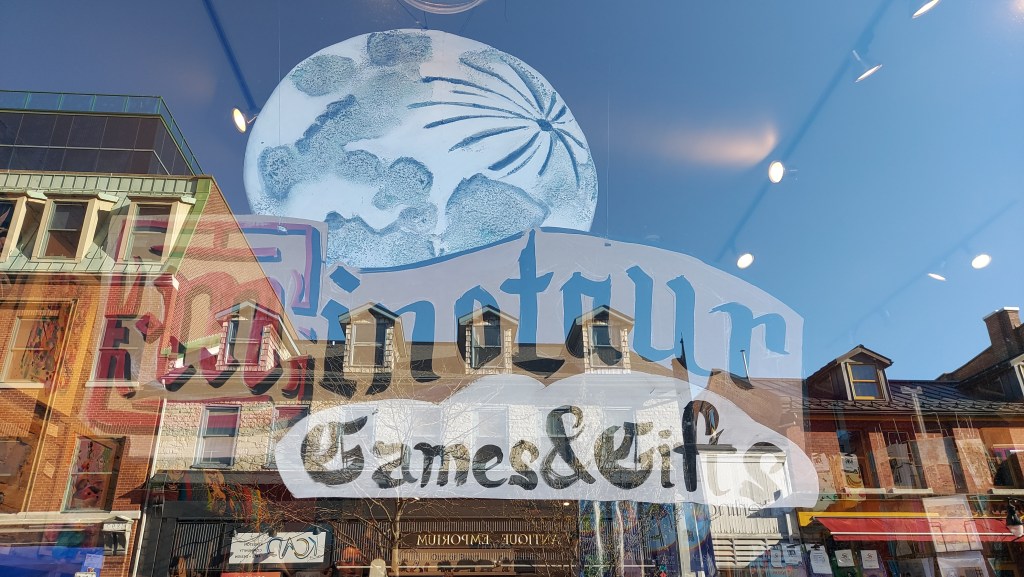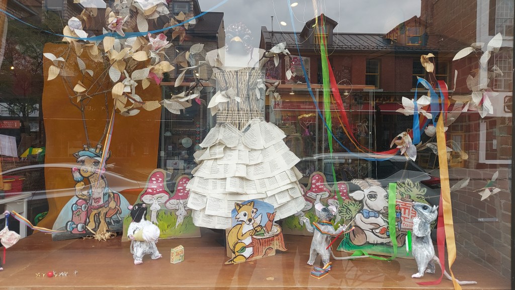 Essa é simplesmente a loja favorita do meu filho. Mas atenção, ela não é uma loja de brinquedos. Ou pelo menos não só de brinquedos. É muito mais que isso. É uma loja de brinquedos, de colecionáveis, de jogos, de papelaria, de livros, de quebra-cabeças… e também têm noites de jogos de tabuleiro e tardes de tricô. E uma outra coisa que eu gostava muito dela era como eles faziam a decoração toda da loja, geralmente com papelão e materiais reciclados, como esse da vitrine acima.