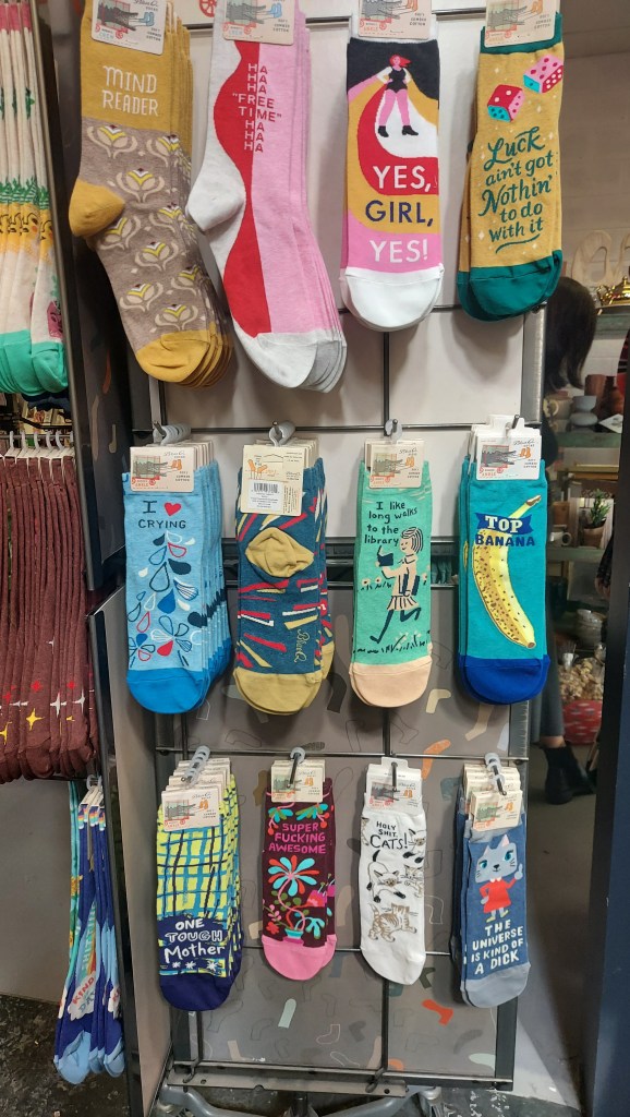 Eles vendem panos de prato (que são diferentes dos nossos no Brasil, ok? São chamados de Tea Towel ou Dish Towel) lindos, com design local, louças, aventais, vasos, cachepôs, flores, ecobags, e, claro, guloseimas como cookies, pães, bolos, chocolates, etc.