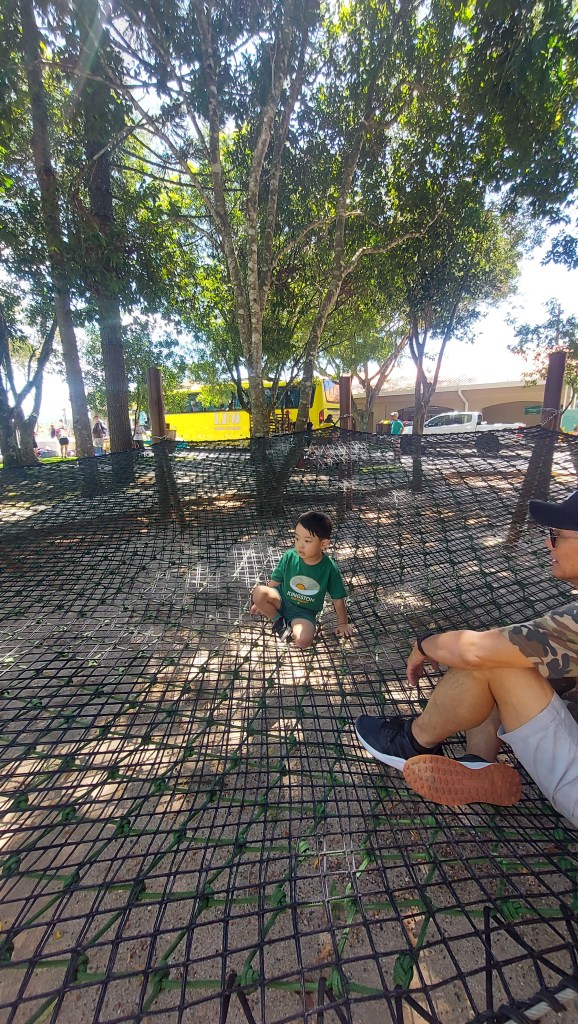 Depois, pegamos o traslado para voltar para o Centro de Visitantes. Fizemos uma pequena pausa no passeio, aproveitando a lanchonete disponível para comer e repor as energias (há ainda um restaurante). Também tem uma área de recreação por lá, que as crianças adoram. Meu filho curtiu o pula-pula, que era uma rede enorme presa nas próprias árvores. Bem divertido.