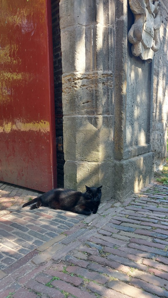 Há também uma das portas, que foi a principal entrada do castelo e cujos adornos permanecem, pelo menos alguns, e aos pés de onde um gatinho parou para descansar.