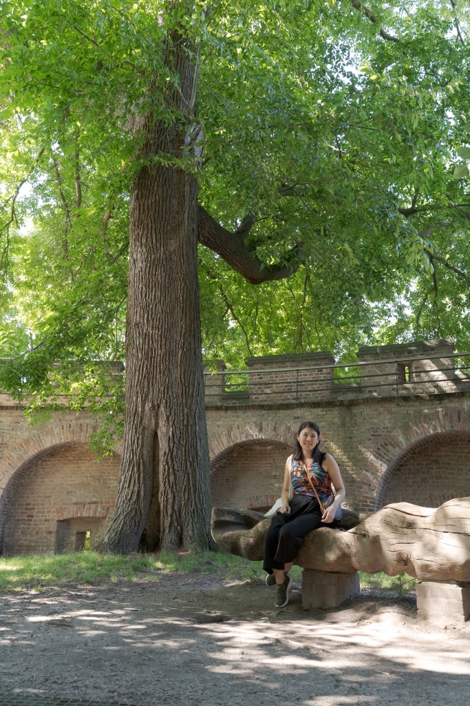 Dentro do castelo, porém, não há exatamente um castelo. Atualmente, há uma frondosa árvore e um banco em madeira esculpido como um tubo de pasta artística, acredito eu, além do fosso que já mostrei acima.